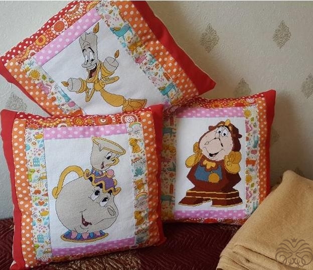 Так случилось, что у меня в закромах оказалась серия вышивок с героями милого диснеевского мультфильма "Красавица и чудовище". Миссис Заварка с Чипом, Люмьер и Клокссворд ждали своего часа несколько лет, пока я не собралась порадовать свою младшенькую дочку уютными подушечками. Мне для этой цели понадобилось не так много материалов: