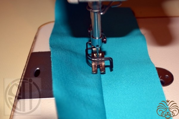 - Сложить верхнюю и нижнюю часть пояса уравниваю верхний срез. Стачать швом шириной 10мм, длиной стежка 2,5-2,7мм