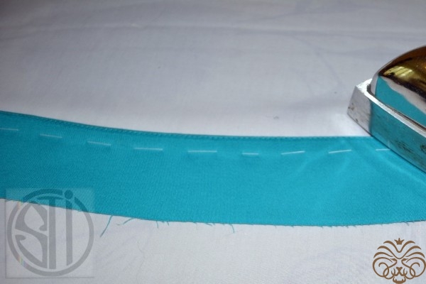 - Для предотвращения растяжимости верхнего припуска необходимо настрочить на припуск дополнительную х\б или атласную полоску шириной 5мм, укладывая ее возле шва стачивания частей пояса