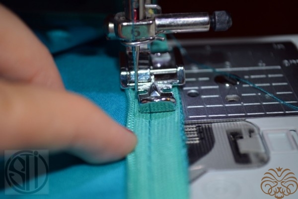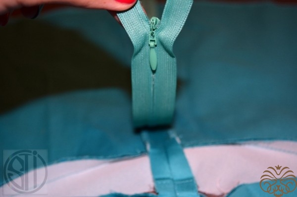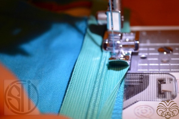 - пришиваем молнию как можно ближе к спирали при помощи специальной лапки. Для того чтобы закрыть молнию без порыва ткани, при притачивании молнии, одну из сторон, точнее строчку в конце плавно увести на пару мм в сторону.