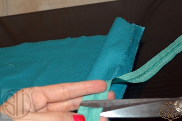 - отрезать лишнюю молнию. От этого отреза срезать тесьму, обогнуть конец втачанной молнии и закрепить на машине, таким образом, чтобы концы спирали были бы как в «кармашке»