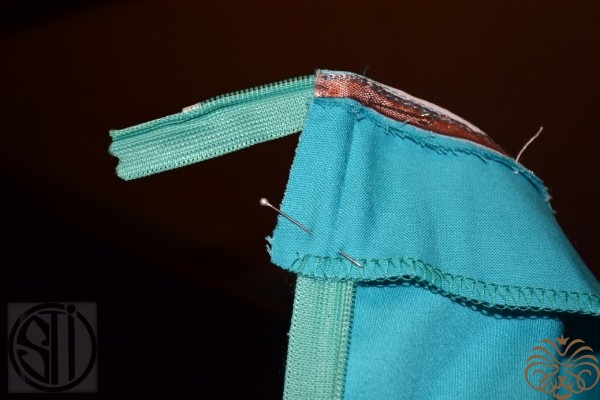 - приложить закрытую молнию бегунком к припускам и пришить машинной строчкой на 2-3мм от спирали молнии к припуску, длиной стежка 5мм. Очень внимательно наблюдаем за тем, чтобы молния по припускам лежала, ровно не перекашиваясь в какую-либо сторону.