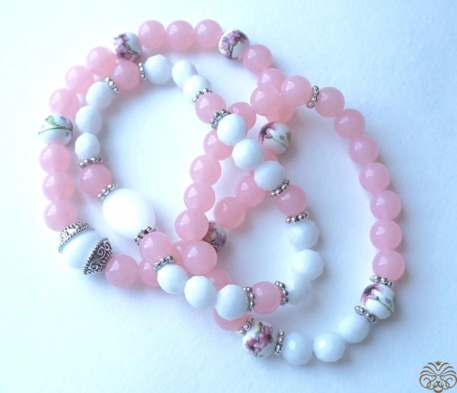 Добавляем с каждой стороны по три розовые бусины. Затем одеваем бусину с рисунком. Повторяем эту комбинацию до тех пор, пока не получим браслет нужного диаметра.