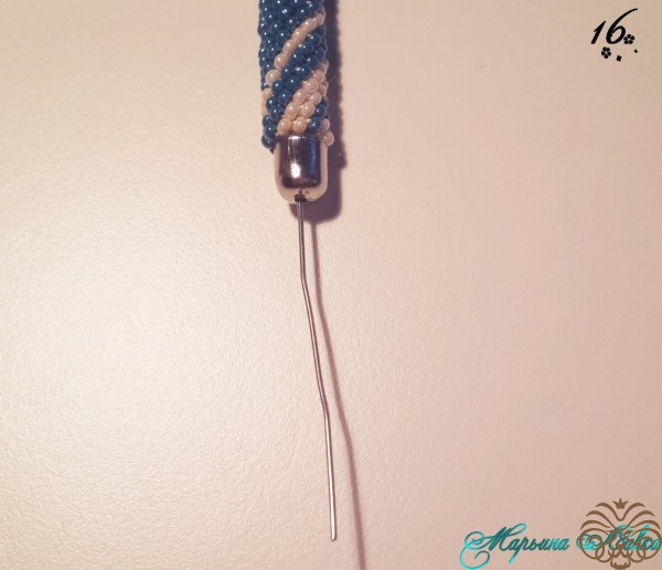Далее на равных расстояниях крепим соединительные колечки на цепочке, у меня вышло 6 колечек. Также второй свободный конец присоединяем к другому коннектору, так, чтобы цепь оказалась на одной стороне от жгута.Теперь, необходимо закрепить бусины и разделители для бусин на пинах, по такому же принципу как мы делали концы для жгута (90 градусов, а потом крутим на себя). У меня получилось 7 таких бусин.