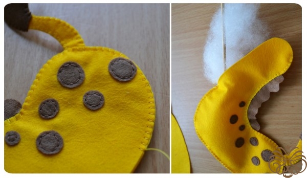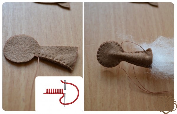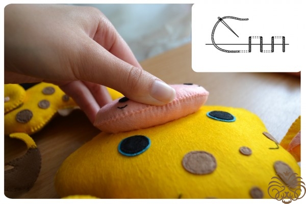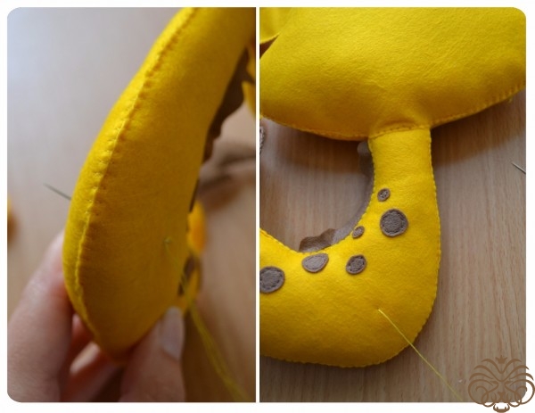 Плотно набиваем голову синтепоном. У нас внутри головы торчит вшитая шея и нужно будет равномерно разместить немного синтепона под ней и на ней. Заканчиваем обметочный шов. Проверяем, что наш жираф держит голову! Если он голову не держит, то тут может быть три причины: 1. Плохо набита синтепоном шея 2. Шея вставлена в голову не достаточно глубоко 3. Синтепон не правильно распределен в голове в районе вшитой шеи