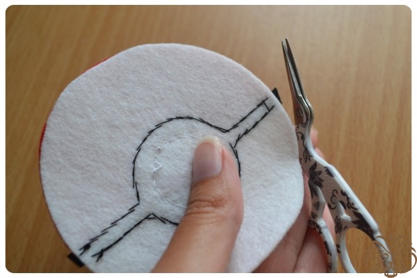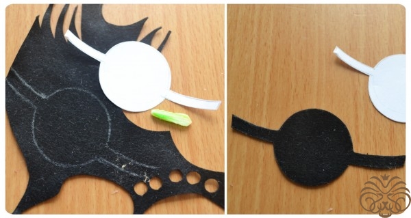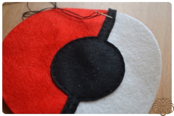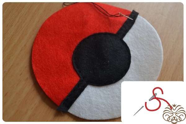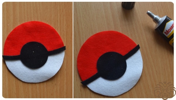 На белом круге раскладываем красную половинку Бола и черную разделительную деталь. Для удобства пришивания зафиксируем все эти детали клеем Момент Кристалл. Нам нужно поставить лишь пару мелких капель