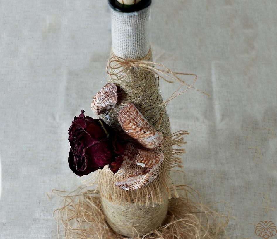 Возьмем пустую стеклянную бутылочку любой формы. Кстати, не обязательно пустую, у меня в бутылке еще есть вино-это никак не помешает, может даже наоборот-поможет))). Так же берем шпагат, мешковину, ракушки и сухие лепестки роз, ножницы и клеевой пистолет. Все приготовили-поехали...Первым делом нужно очистить бутылку от этикеток. Я это делала с помощью воды и губки для мытья посуды, намочив этикетку-она легко отходит от стекла.Не страшно, если останутся мелкие бумажные элементы.