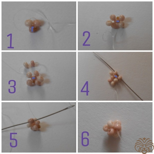 На леску с оплавленным кончиком для фиксации бисерин, нанизываем 3 бисеринки, и входим в первую бисерину на низке, это будет основой для нашего квадратного трёхгранного жгута, вместо 4-х граней. На фото она отмечена фиолетовым цветом.Далее набираем ещё 3 и опять входим, в ту же бисерину, образуя первую "грань" жгута. Основа имеет 3 бисерины, а грань-4, и следующим шагом будет: войти в следующую бисерину в основании, нанизать 2 бисеринки и пройти иглой бисерину грани, и замкнув круг в той же бисеринке в основании, с которой начали, образовав ещё один крестик-"грань". На фото под №4 повторяем предыдущий шаг, но начиная образование крестика из 3-ей бисерины основания,входим в бисерину крестика, нанизываем новую и входим в бисерину другого крестика, образуя 3-ю грань. После, лучше опять пройти те же бисерины: основания, крестика, и новую вплетённую, выходим из последней, продолжая таким образом плести жгут (мой достигает в длину 33 крестика).