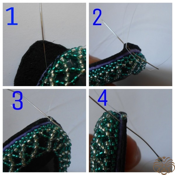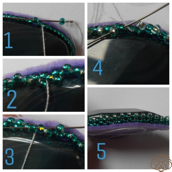 Создаём цепочку, обрамляющую кабошон. Работаем с последним мозаичным рядом: выходим из его бисерины и набираем 2 тёмных, 3 светлых бисеринки, пропуская одну бисерину, входим в следующую, образуя ячейку.Продолжаем плетение вдоль всего кабошона. Вернувшись к первой ячейке проходим через её светлые бисерины, выйдя на новый ряд, и продолжая предыдущие действия. Фото №4,5,7 для кабошонов каплевидной формы. Под заострённой частью кабошона должны получиться 2 ячейки, как на фото, между ними не вплетаем бисерин, а просто проходим через верхние бисерины ячеек. Выполняем третий- заключительный ряд цепочки в котором нам понадобятся только тёмные бисерины. Выйдя из верхней бисерины предыдущего ряда, набираем 3 тёмные бисерины, и проходим через следующую ячейку, т.о. затягивая нашу цепочку. Совет: чтобы избежатьнеровностей и стяжек, лучше использовать нить а не леску, на данном этапе. Фото №8 выходим иглой на изнанку,закрепляем нить и обрезаем. 9 фото- обрезаем ненужный фетр по краям.