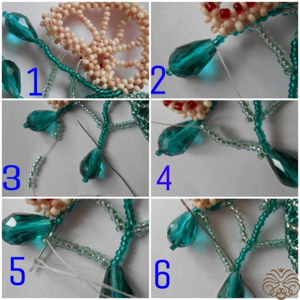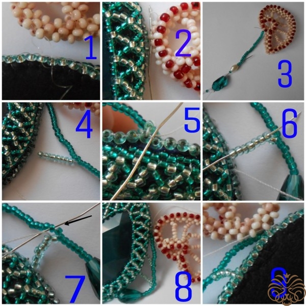Украшаем нижнюю часть кабошона бисерной бахромой (используем нить). Выходим из бисерины,обшивающей край кабошона, и набираем 7 бисерин-бусину каплю- 1бисерину (здесь вы можете выбрать другое кол-во бисерин, но после капли должна следовать только одна бисеринка). Проходим иглой через бусину и 3 бисерины, нанизываем ещё 2. Отсчитаем 3 бисерины, от той из которой вышли, входим в 3-ю. С обратной стороны, пропуская пронизаную бисерину в обшивке, входим в бисерину (фото№4) и набираем ещё 7, получится ячейка. Пропуская 1 бисерину, входим во вторую. Выполняем действие показанное на фото № 6, делаем середнюю подвеску, по тому же принципу что и первую(перед ячейкой), но она должна быть длиннее. В средней, я использовала речную жемчужину, чтобы удлинить подвеску.Получается в бахроме 3 подвески(1 в середине, 2 по краям), а между ними 2 ячейки. Сделав среднюю подвеску, повторяем те же самые методы плетения, но сначала сделав ячейку, а потом крайнюю подвеску.