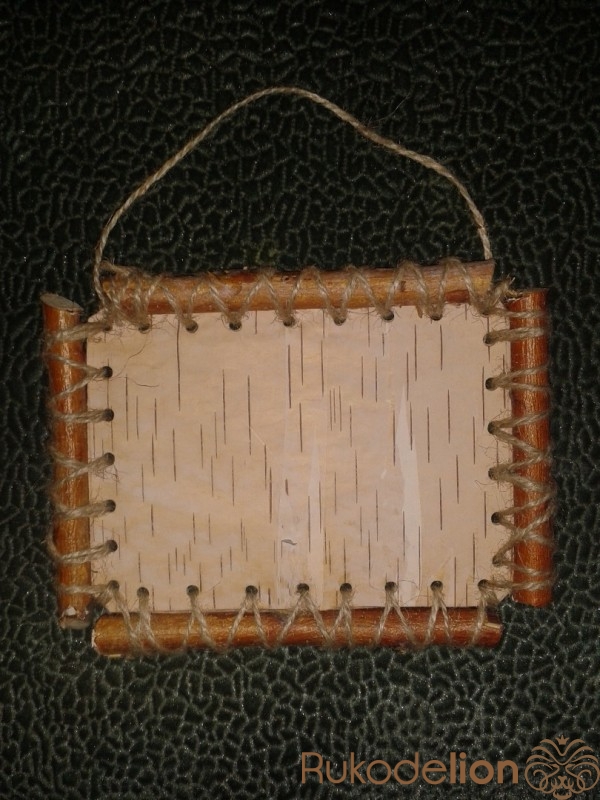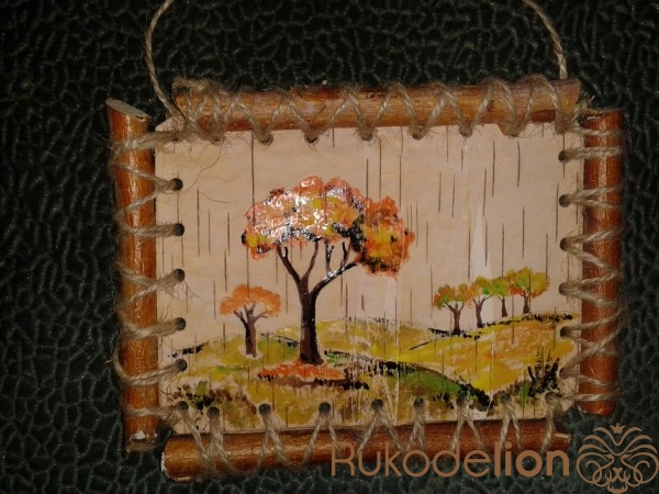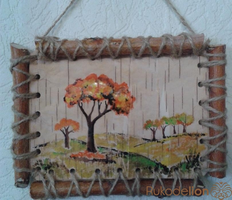 1 - Заготовим для нашей картины рамочку. Для этого спилим веточки потолще, такого размера, какого размера найдётся кусок бересты. Я заготовила ветки берёзы.