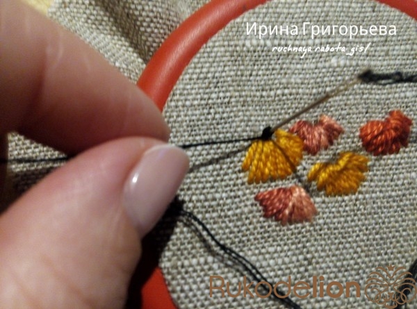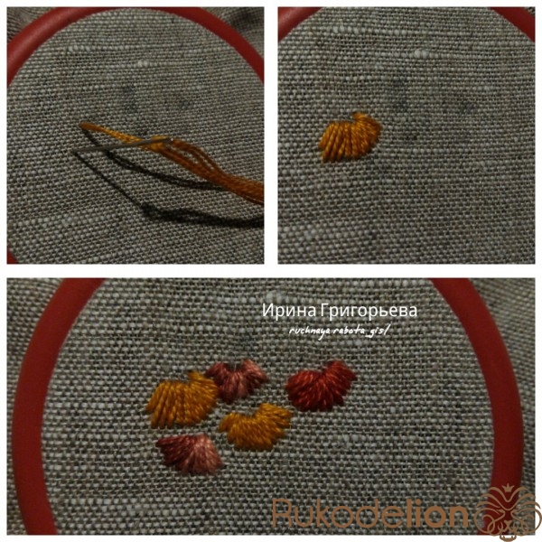 Вышейте листву мелких цветочков швом "полупетля с прикрепом". Выведите иглу с нитью у основания цветка, сделайте прямой стежок. Выведите иглу с нитью слева от цветка и заведите иглу на изнанку справа от цветка. Выведите иглу внизу прямого стежка, захватите образовавшуюся петлю и уведите иглу на изнанку.