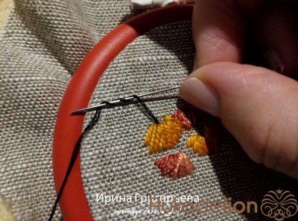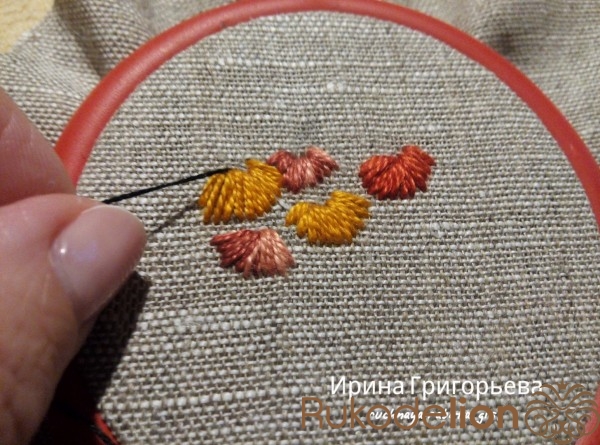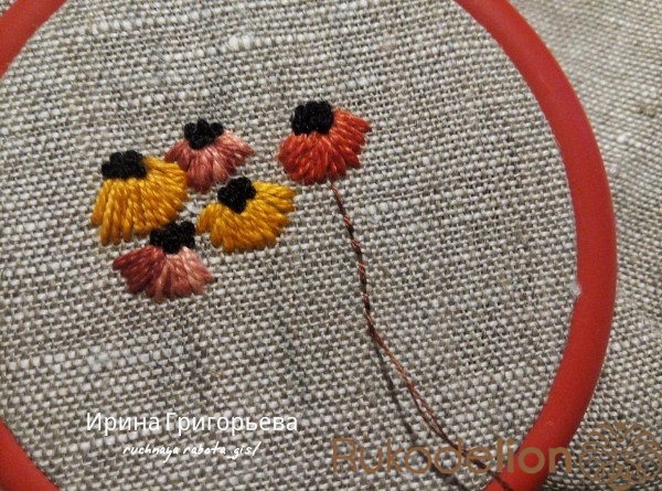 Отметьте карандашом основания цветов. Сделайте у каждого основания несколько прямых стежков нитью в два сложения (жёлтыми и рыжими оттенками). Сначала протяните иглу с нитью на лицевую сторону, выполните стежок нужной длины и выведите иглу на изнаночную сторону.