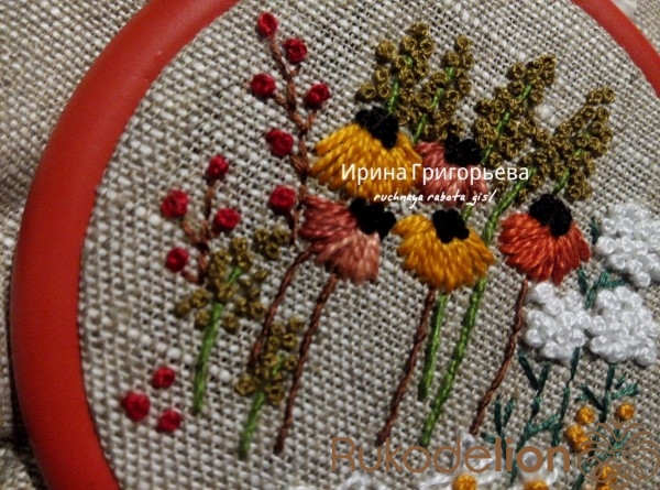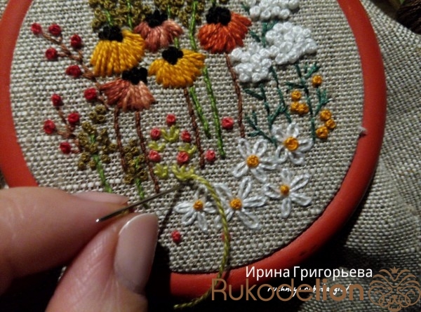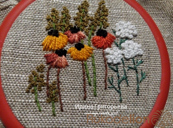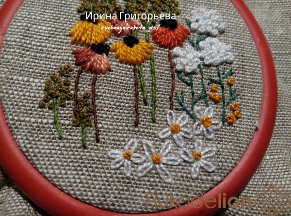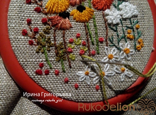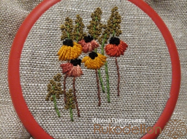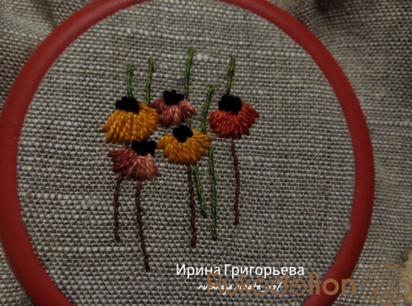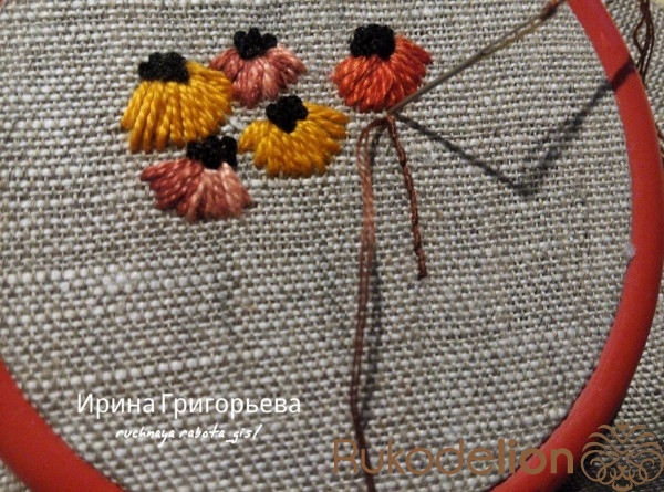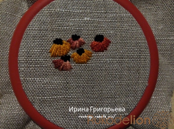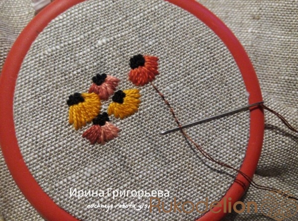 Сердцевины цветов вышейте французскими узелками нитью чёрного цвета в одно сложение. Протяните иглу с нитью на лицевую сторону, расположите иглу параллельно ткани-основы, сделайте три навива нитью на иглу, витки не должны путаться (должны лежать друг за другом), придерживая их пальцем, введите иглу в ткань рядом с выходом иглы, левой рукой подтяните нить, чтобы витки затянулись на игле, но сильно не затягивайте. Протяните иглу на изнаночную сторону, протягивайте до тех пор пока не образуется узелок.