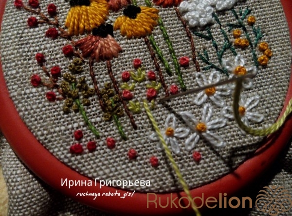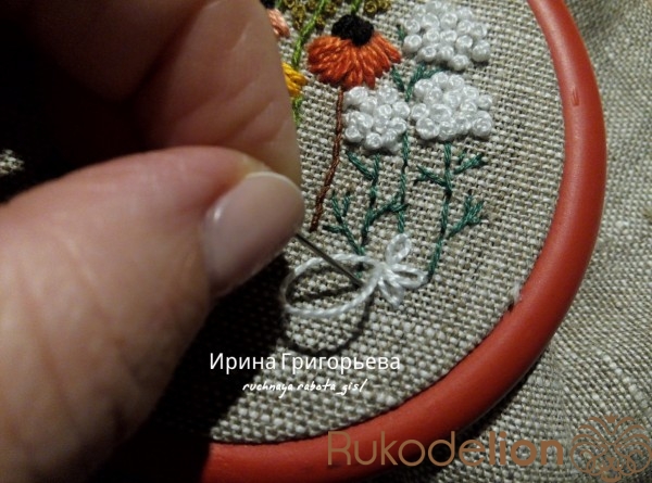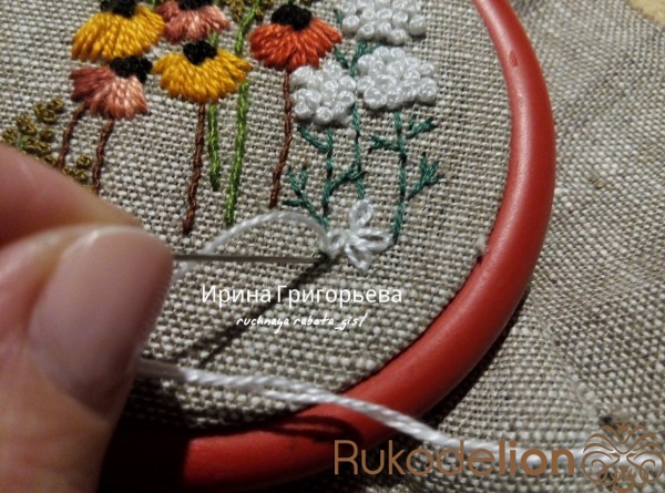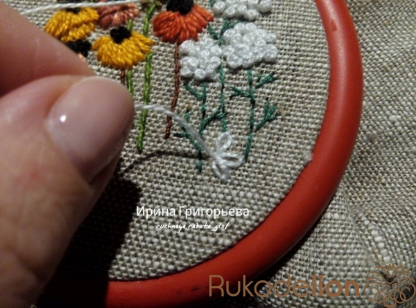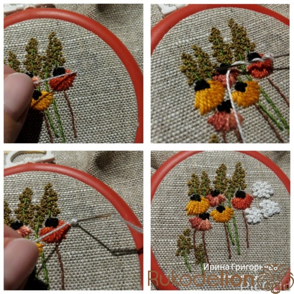 Белой нитью швом "петля с прикрепом" вышейте ромашки. Выведите иглу с нитью на лицевую сторону, проведите иглу на изнанку в плотную к предыдущему проколу. Выведите иглу на лицевую сторону в конце образовавшейся петли, подтягивание нить, пока не образуется петля нужной формы, уведите иглу на изнаночную сторону, обхватив конец петли.