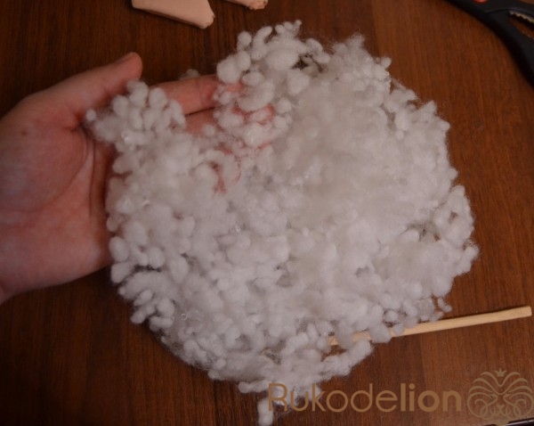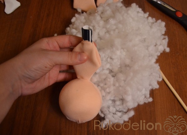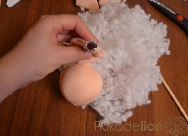 А теперь небольшой, так сказать, лайфхак) Для того, чтобы наполнить небольшие отверстия , скручиваем в трубочку кусочек плотной бумаги. Вставляем нашу трубочку в отверстие и с помощью палочки начинаем набивать тело. Не нужно набивать плотно! Особенно шею, иначе появятся некрасивые заломы.
