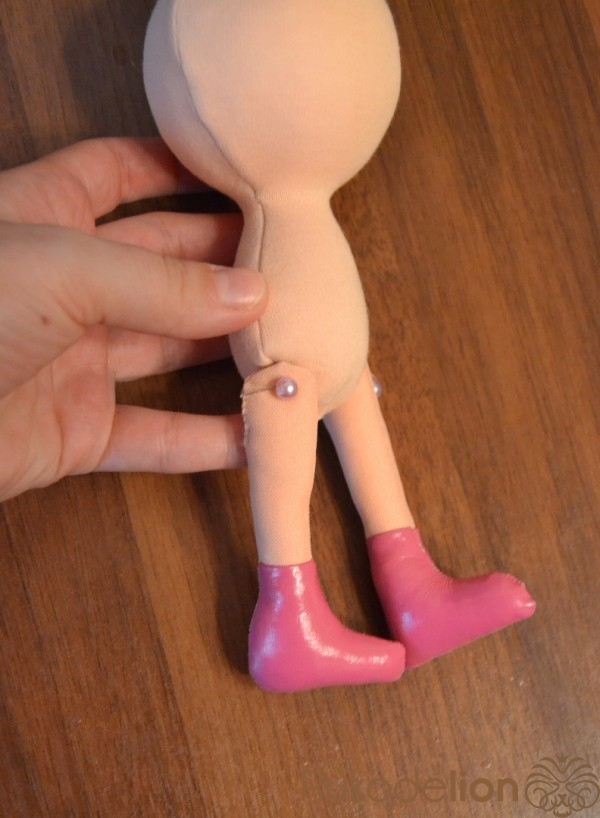 Чтобы куколка могла сидеть, ножки пришиваем "пуговичным креплением". Я использую бусинку. Прикалываем ноги к туловищу. Проверяем - все ли ровно? Пробуем во всех положениях ног, т.е. и стоя и сидя должно быть все симметрично. Нитку с иголкой выводим через туловище. Теперь берем вторую ногу и выводим нитку с иголкой снаружи вовнутрь, через место отметки.