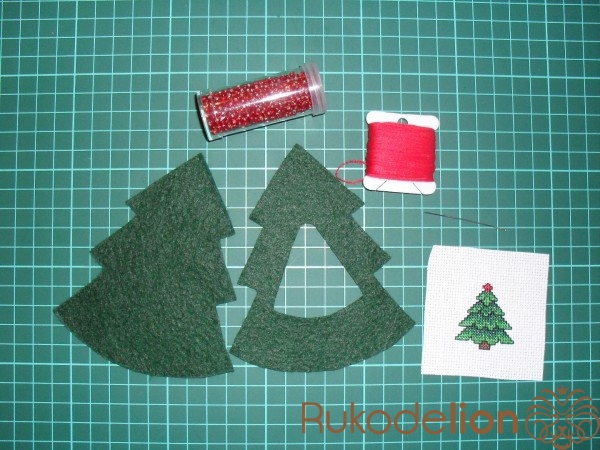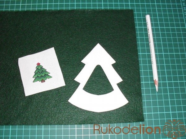 Из зеленого фетра, по шаблону вырезаем 2 заготовки елочки, в одной делаем окошко под вышивку.