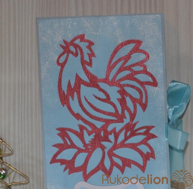 Оформляем верхнюю крышку шоколадницы. Для этого вырезаем картинку в технике вытынанка. Это может быть картинка с елочным шариком, елочкой, Дедом Морозом или любой другой новогодней тематики. Поскольку наступающий 2017 год будет годом огненного петуха, то я взяла картинку с петухом и темно-красную бумагу для скрапбукинга. С помощью степлера скрепляем картинку с бумагой для скрапбукинга. На мате для резки цанговым ножом вырезаем картинку. В результате у меня получился вот такой петушок.