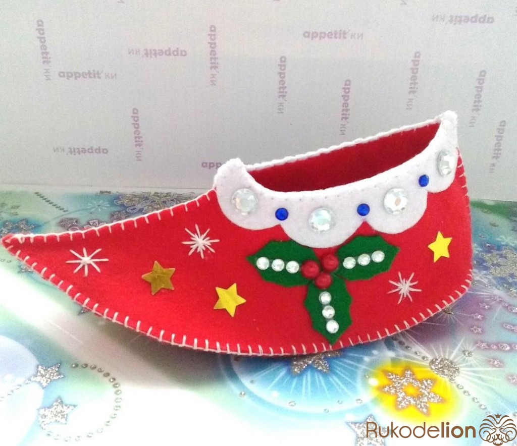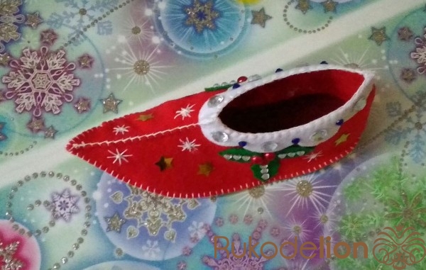 Новогодний башмачок ручной работ выполнен по индивидуальному заказу. Авторский дизайн. сшит полностью вручную. Украшен вышивкой, стразами и пайетками. В длину примерно 16 см.