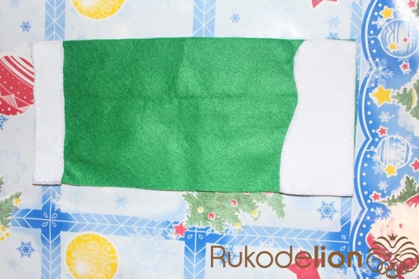 Берем зеленый фетр и вырезаем два прямоугольника 14 на 30. И круг диаметром 9.