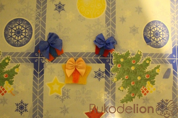 Из красного, жёлтого и оранжевого фетра, вырезаем подарки