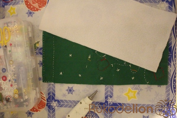 Берём вторую часть чехла, иголку и нитку под цвет зелёного фетра. И сшиваем обе части чехла петельным швом. Сшиваем по бокам