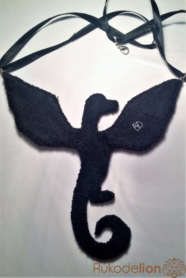 Ожерелье, выполненное в виде черного дракона с переливающейся чешуей из пайеток и блестящими черно-золотыми крыльями, оживит ваш ежедневный образ, придав ему незабываемый магический вид. Благодаря подкладке из мягкого фетра ожерелье не раздражает кожу. Данное ожерелье будет хорошо смотреться с неброской однотонной одеждой, так как оно само по себе привлекает внимание.