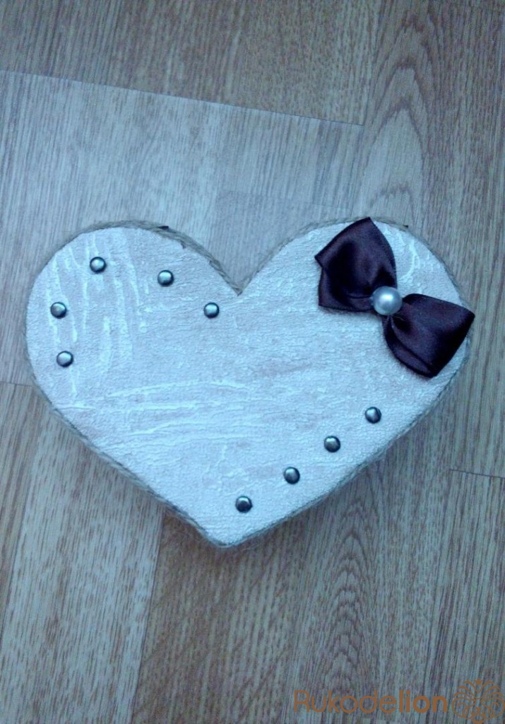 3. Приступаем к формированию каркаса. Две прямоугольных детали (для боковых стенок) необходимо хорошо «промять», чтобы они лучше загибались. Затем поочередно приклеиваем одну и вторую деталь к основанию (дну) коробочки. Итак, каркас готов. Приступаем к упаковке. Начнем с упаковки крышки. Для этого берем сердце из бумаги большего размера и по его краям делам надрезы (для отгиба). Приклеиваем бумажную деталь к основной при помощи клея-карандаша, оставляя место для отгиба. Затем, с помощью клеевого пистолета приклеиваем отгиб к внутренней стороне крышки. Внешняя сторона готова. Крышка коробочки будет крепиться лентами. В местах крепления крышки на двухсторонний скотч крепим ленты длиной 3-4 см, оставляя свободный край для дальнейшего крепления к коробке. Ленты с двух сторон необходимо заранее обжечь, чтобы они не расползались. На внутреннюю сторону крышки на двухсторонний приклеиваем сердце из бумаги, подготовленное для внутренней стороны. Затем контур сердца декорируем шпагатом. Приступаем к упаковке самой коробочки. Сначала обклеим боковые стороны. По краям прямоугольников большего размера вырезаем зубчики (для отгиба). Поочередно клеим их на внешнюю сторону боковых стенок. Отгибы приклеиваем клеевым пистолетом с одной стороны (вовнутрь коробочки) и с другой (на внешнюю сторону дна коробочки). Для упаковки дна приклеиваем заранее подготовленное сердце из бумаги к внешней стороне дна. Декорируем шпагатом по краю основания, как и в случае с крышкой. Приступаем к упаковке внутренней части коробочки. Для начала нам необходимо соединить крышку с основанием. Для этого вовнутрь коробочки на двухсторонний скотч приклеиваем свободные края лент крышки. Далее приклеиваем прямоугольные детали из бумаги по внутренним сторонам стенок на двухсторонний скотч. Декорируем верхний край шпагатом. На дно коробочки приклеиваем сердце из фетра. Внутри коробочки по краю основания декорируем золотой лентой и шпагатом.