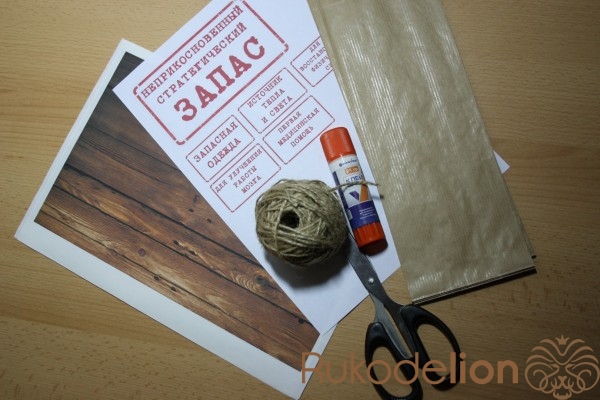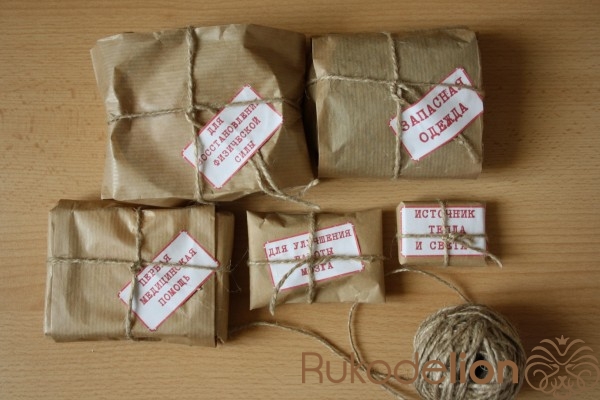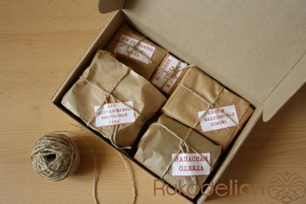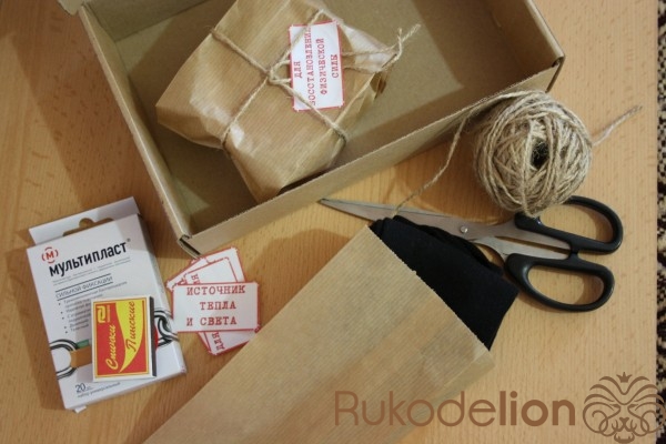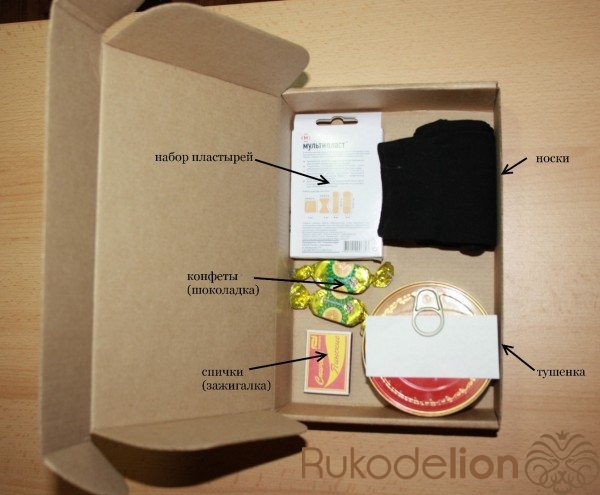 и, собственно, сами подарки. В данном случае это: тушенка, носки, пластыри, конфеты и спички. Но тут, конечно, фантазия может быть безграничной)))