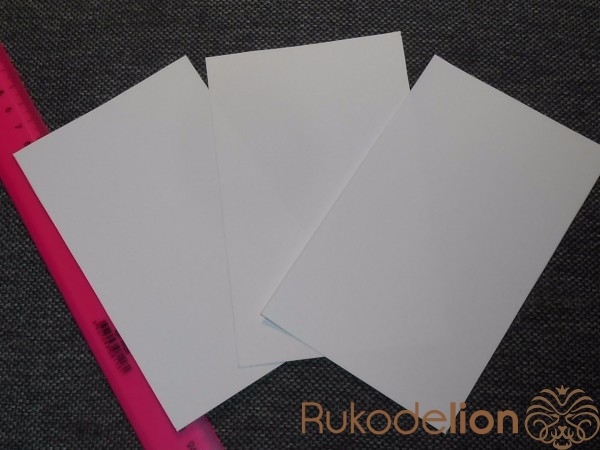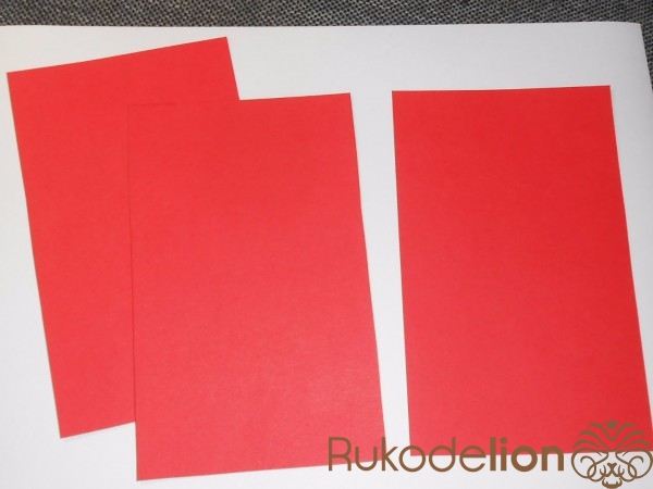 Из красной плотной бумаги вырезаем три прямоугольника размером 9,5x15,5 см. Из белой -три прямоугольника размером 8,5x14,5 см.