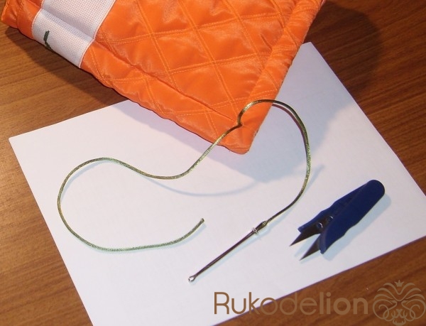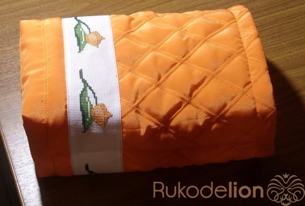 Приметаем и пристрочим тесьму в край. Здесь использована ручная вышивка по канве.
