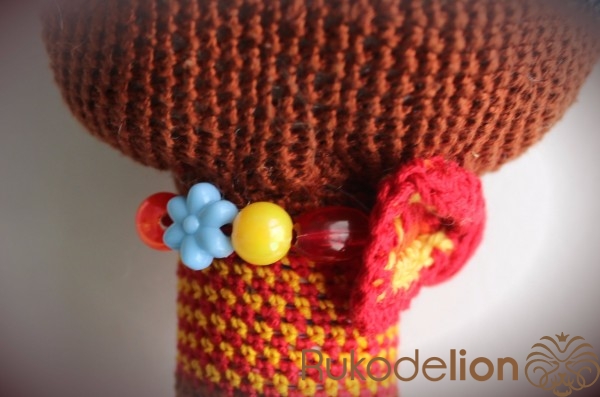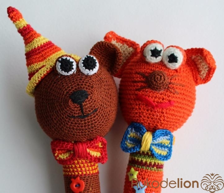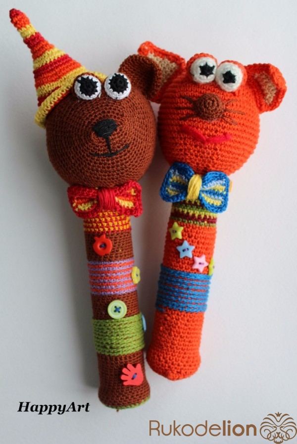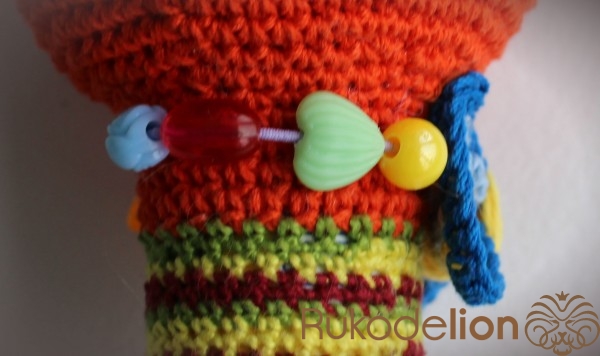 Внутри игрушки находится контейнер с фасолью.В голове у игрушки пищалка. Фактурная обвязка контейнера способствует развитию тактильных ощущений малыша.