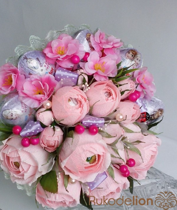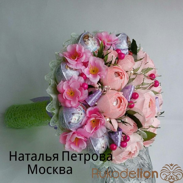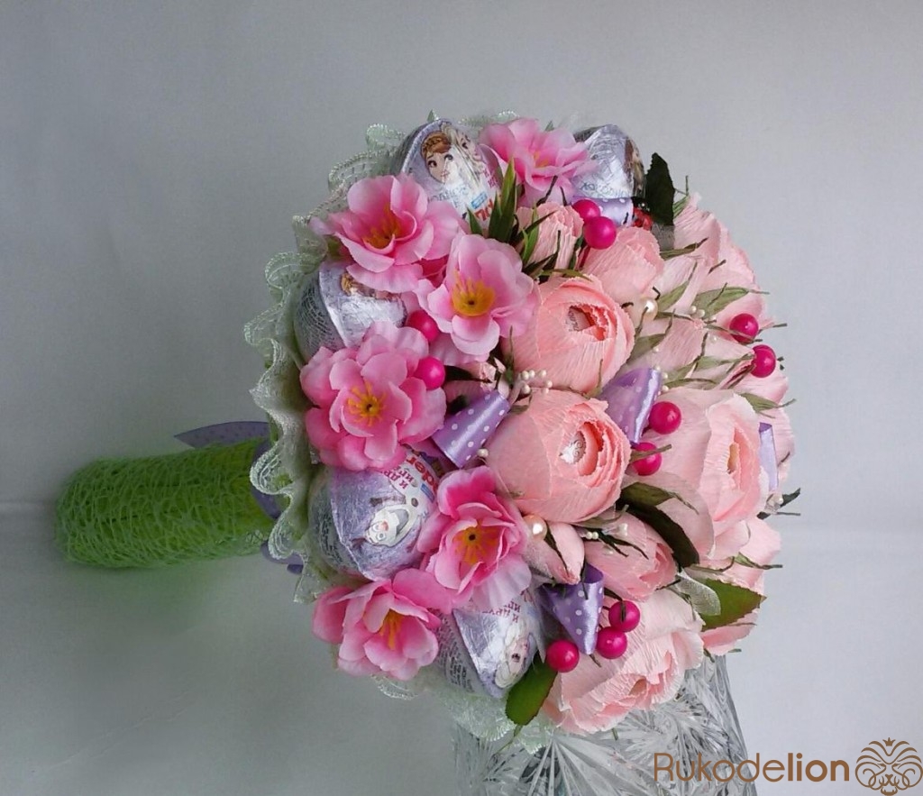 Бумага гофрированная, конфеты ,лента атласная , яйца Kinder сюрприз