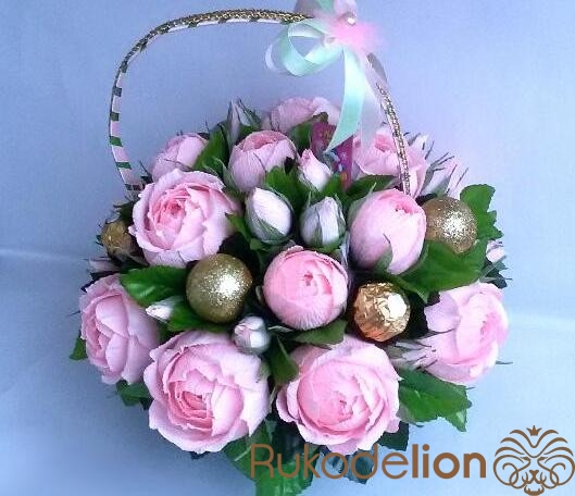 Цветы выполнены из гофрированной бумаги итальянского производства. Использованы конфеты