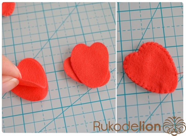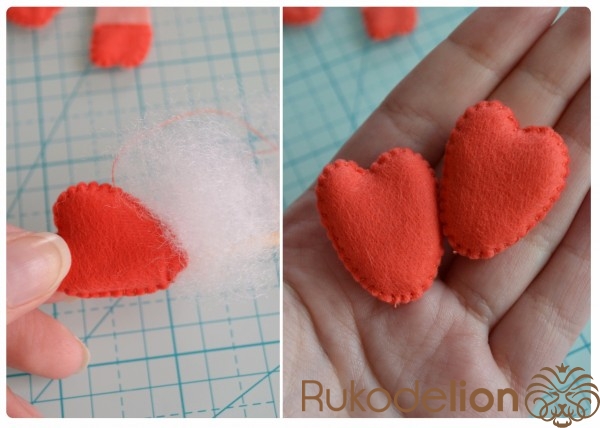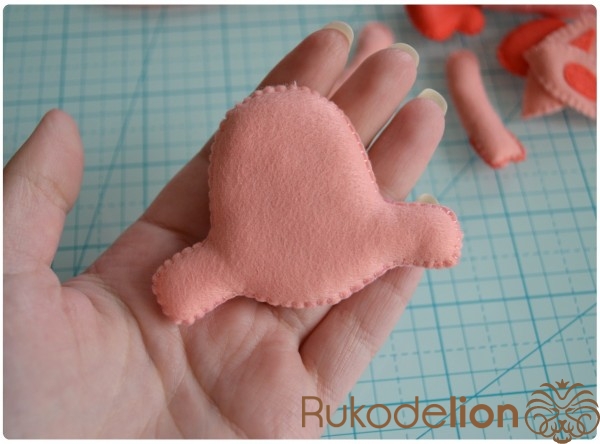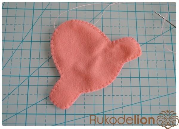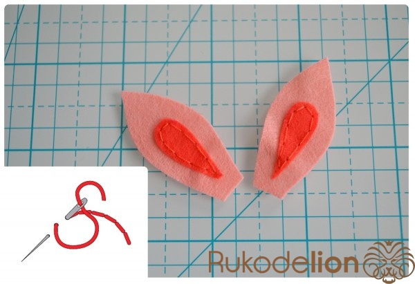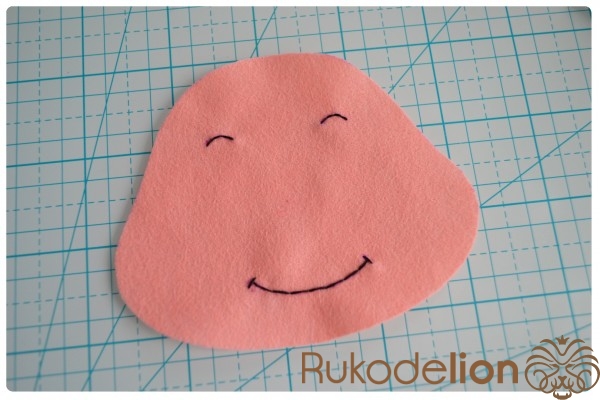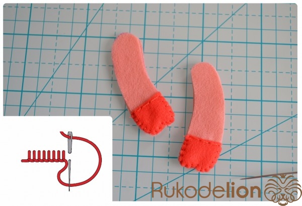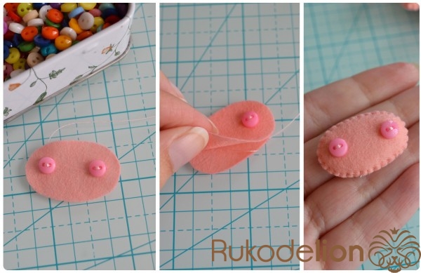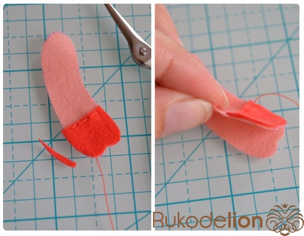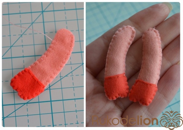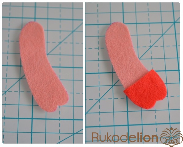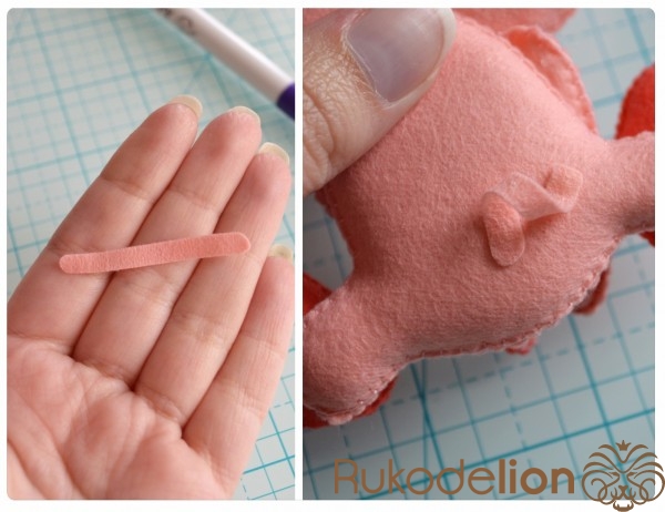 Способ № 1: Простой. Мы вырезаем тонкую полоску розового фетра и закругляем ее кончики. Капелькой клея приклеиваем ее один конец к телу. Затем загибаем ее, делая такую кудряшку, и приклеиваем второй кончик полоски