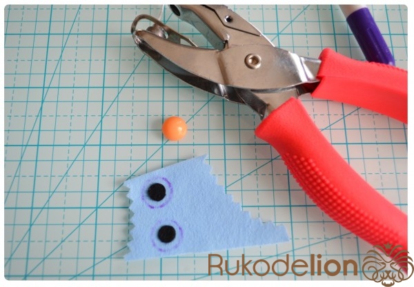 Дыроколом по фетру вырубаем из черного фетра два круга диаметром 5 мм. Если у вас нет такого дырокола, то эти кружочки вы можете вырезать маникюрными ножницами.