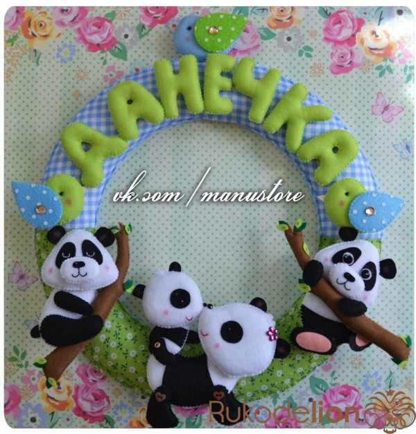 Как это ни странно, но на мое увлечение фетром повлияли именно мои занятия английским языком с малышами. Я часто прошу их принести на занятия какие-нибудь мелкие игрушечки, которые мы могли бы использовать во время урока. Но не всегда ребята помнят мои такие просьбы. И я подумала, что мне нужно самой иметь какие-нибудь интересные фигурки, которые я могла бы применить на занятиях. Я стала искать в интернете какие-нибудь пальчиковые театры, и в итоге нашла изделия из фетра. Правда, больше меня заинтересовали не игрушки для уроков, а именные панно на стену. Мне дико захотелось сшить что-то эдакое, тем более рукодельем я занималась всю жизнь, начиная с бисероплетения и заканчивая вышивкой крестиком по фото. Я показала пару фотографий фетровых изделий своему молодому человеку, а в ответ услышала, что такоооооое я уж точно не смогу сделать. Это лишь больше меня раззадорило и уже на следующий день я стояла в магазине в очереди за фетром, а вечером уже сшивала детали зебры, жирафа и т.д. Так на свет появились мои первые именные панно!