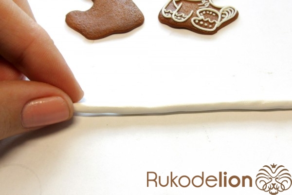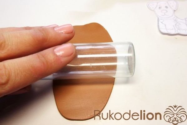 Приложите рукоятку ложки к заготовке в районе лап собачки. При этом белая колбаска на заготовке должна располагаться чуть ниже той глины, которой облеплена рукоятка. Затем сделайте короткую нетолстую белую колбаску и прилепите ее сверху рукоятки также по нижнему контуру глины, которой облеплена рукоятка.