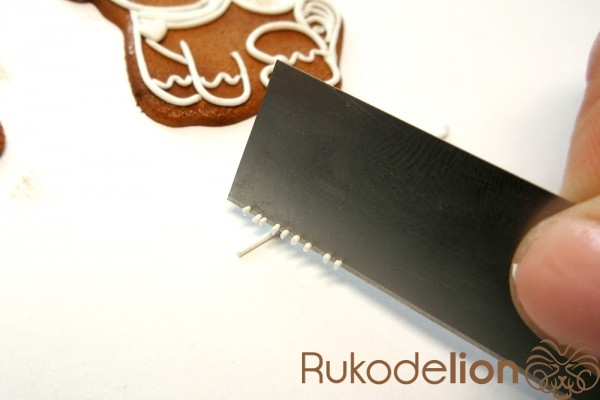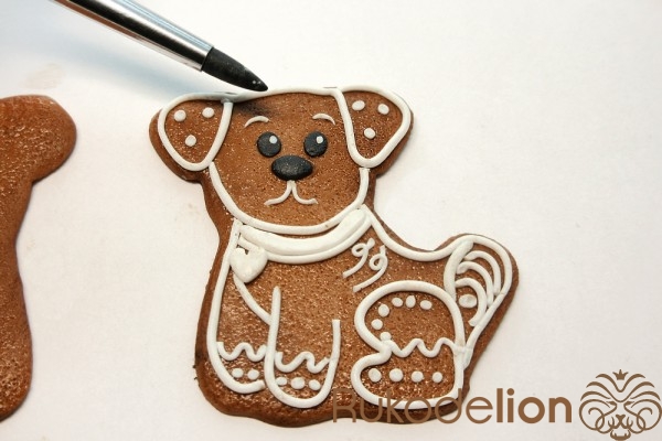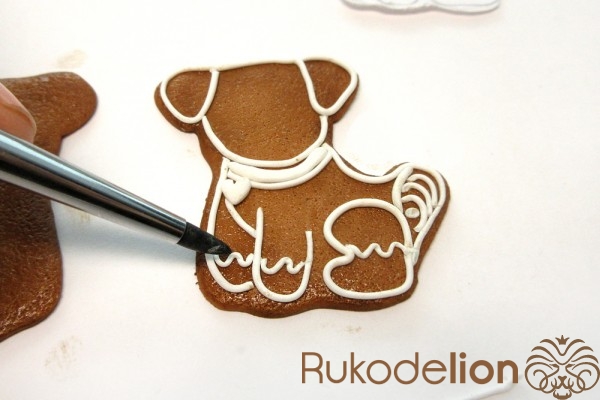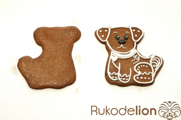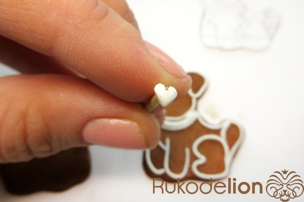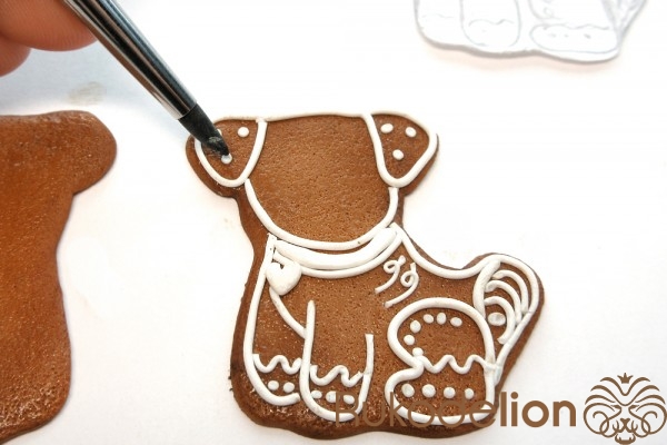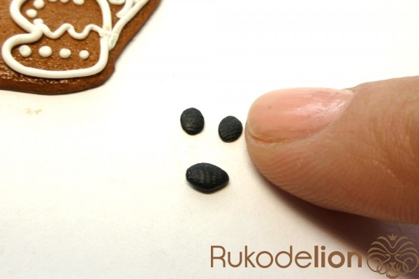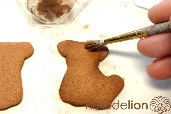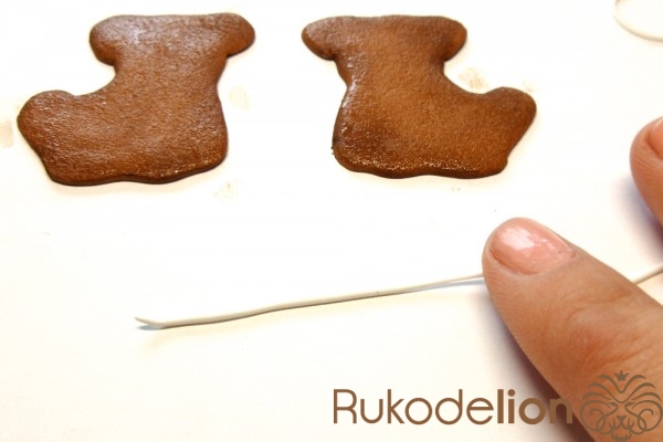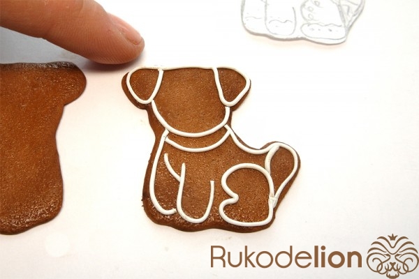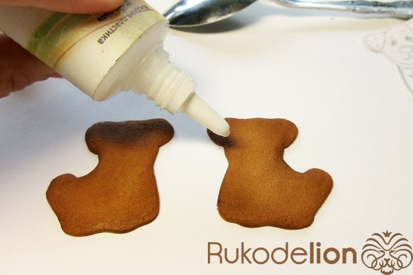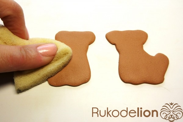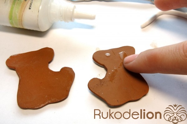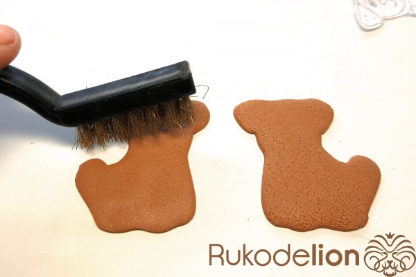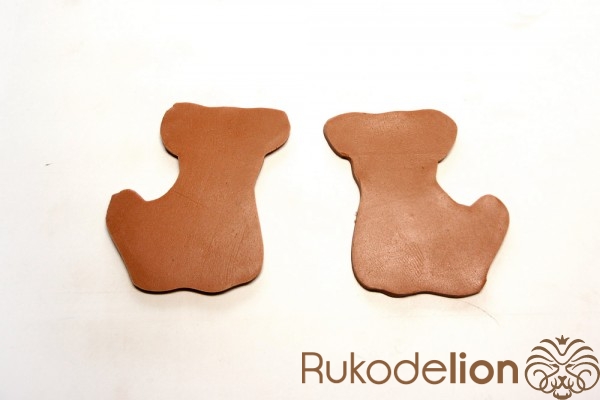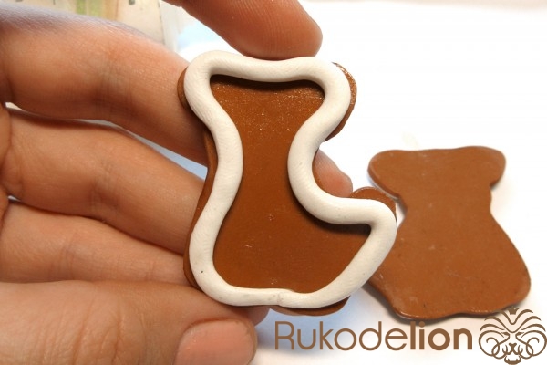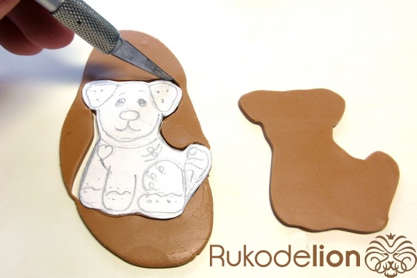 Из этих колбасок нужно выложить на поверхности одной заготовки рисунок, согласно шаблону. Начать выкладывать узор можно с ушек и головы собачки. Чтобы было удобно прилеплять колбаски, используйте любой подходящий стек или зубочистку. Во время работы старайтесь лишний раз не касаться поверхности заготовок, так как они пачкаются из-за слоя жидкой глины.
