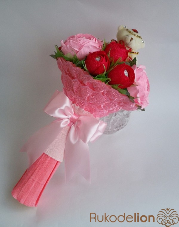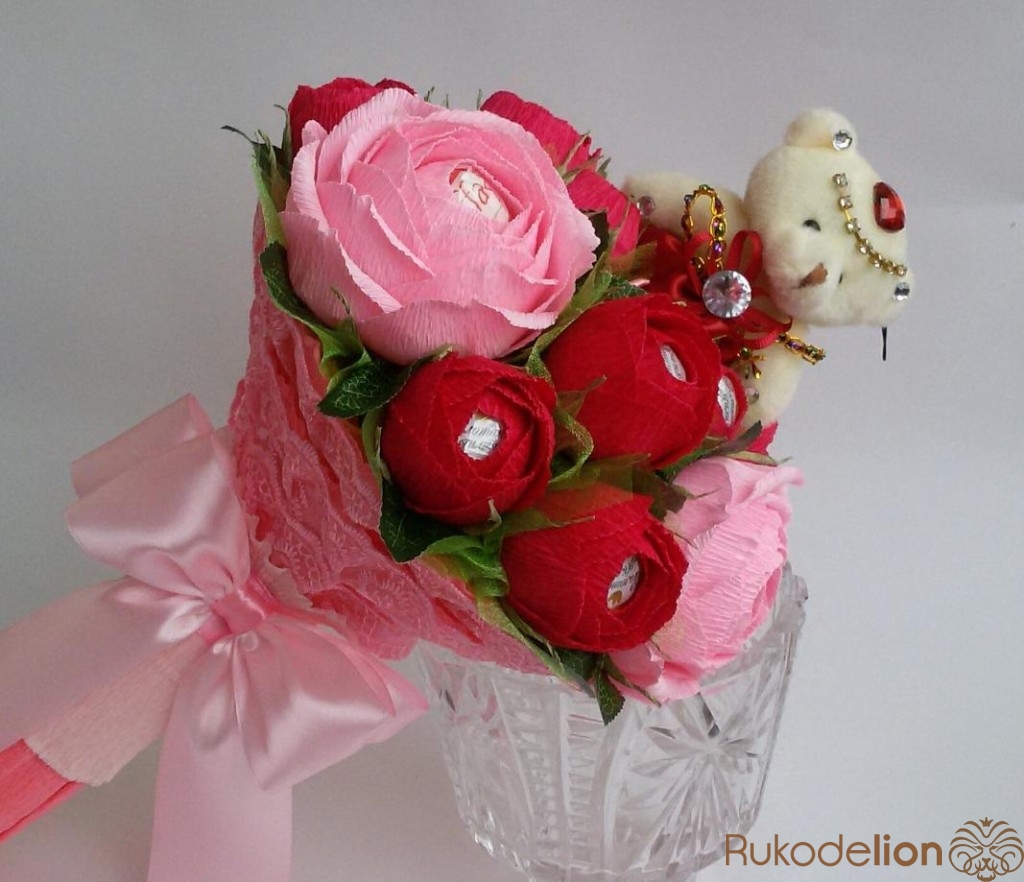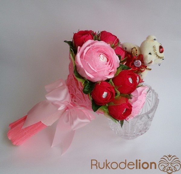Состав : конфеты Raffaello 3 шт , Золотая лилия 12 шт , мишка 12 см