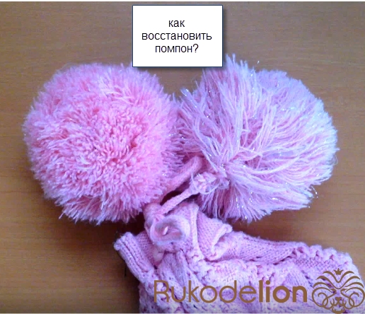 зачастую после стирки помпоны становятся примятыми,некрасивыми. Чтоб восстановить вид нужно взять пуходерку для животных,или щетку для волос с железными зубчиками,и хорошенько вычесать его. потом,что вылезло обрезать ножничками.и помпон станет красивым!