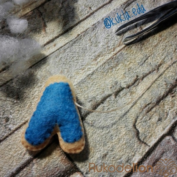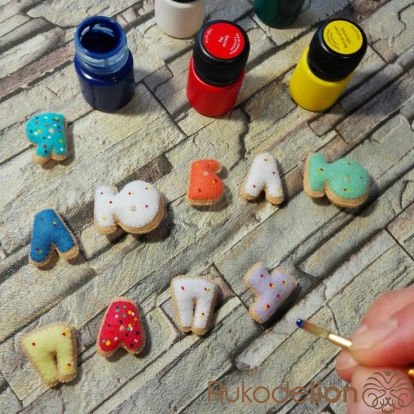 Сшиваю обе половинки буковки между собой и набиваю синтепухом. Глузурь в качестве декора рисую акриловой краской. Даю краске время высохнуть.