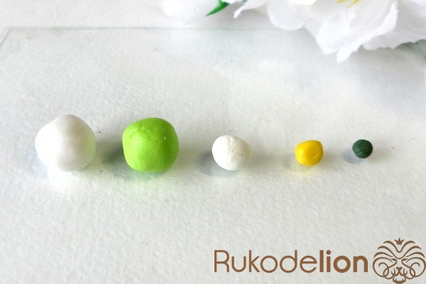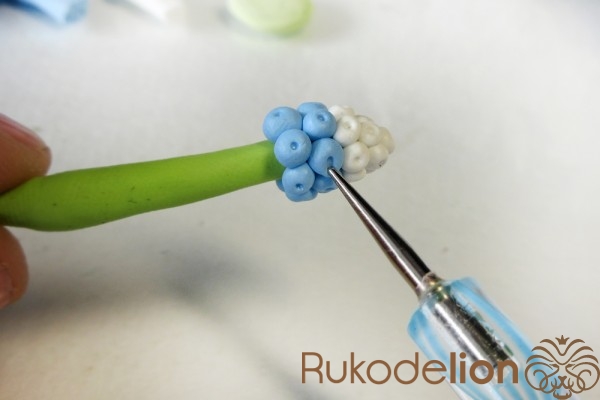 Пока стебли запекаются, можно подготовить подходящие оттенки глины для лепки соцветий. Для первого оттенка можно взять глину синего цвета, если нет синей, то можно взять голубую и небольшую часть фиолетовой. Для остальных оттенков берем голубую глину, белую, а также белую и зеленую в тех пропорциях, которые указаны на фото.