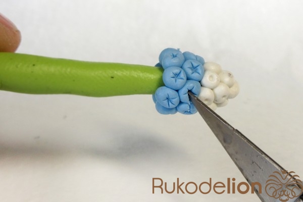 Теперь берем уже запеченный стебель, берем сырой кусочек той глины, которой облепляли стебли, и надеваем его на верхушку стебля. Нужно таким образом облепить слоем сырой глины верхушку стебля длиной 3-3,5см (в зависимости от размера цветка, который вы хотите сделать). Зубочисткой или стеком сглаживаем нижний край сырой глины, стараясь его примазать к стеблю.