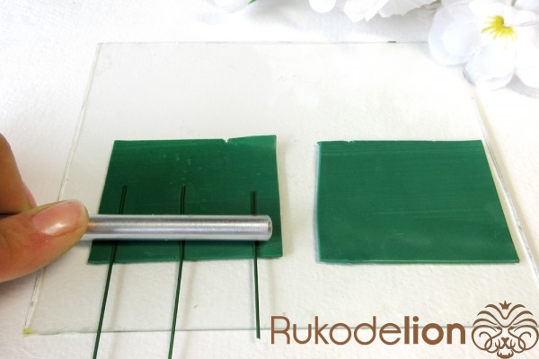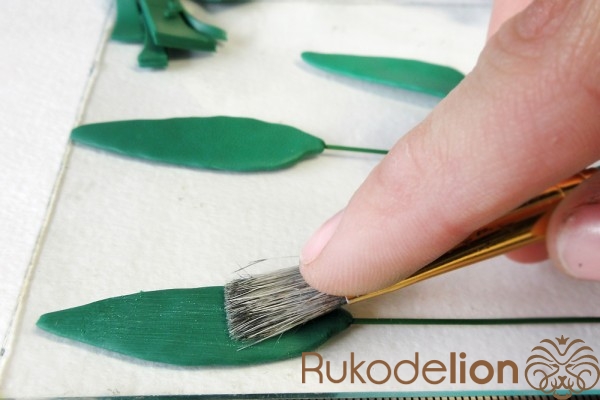 Теперь этой глиной нужно обтянуть проволочные отрезки. Для этого хорошо разомните небольшой кусочек глины, наденьте его на проволоку и растягивайте по проволоки глину равномерно, прокручивая ее в пальцах и растягивая глину к краям отрезка. Важно, чтобы стебли получились максимально ровными. При этом несколько сантиметров проволоки внизу стеблей оставьте без глины.