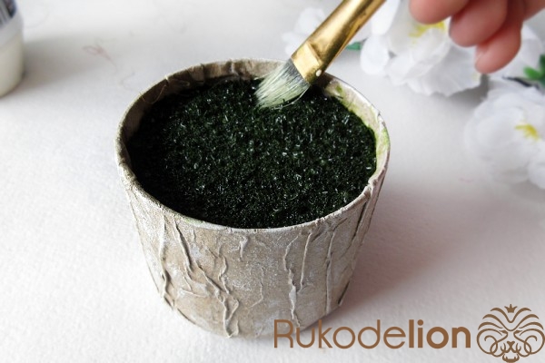 Когда все цветы и листья будут готовы можно поместить их в вазочку или в горшочек. Если вы хотите использовать горшочек, то в качестве основы, в которую будут вставляться цветы, можно взять специальный флористический оазис или же плотную поролоновую губку. Для этого вырежьте кусочек губки нужно формы и пропитайте ее клеем ПВА, поместите в горшочек. Сверху губку окрасьте темно-зеленой акриловой краской и оставьте на несколько часов, чтобы клей в губке подсох.
