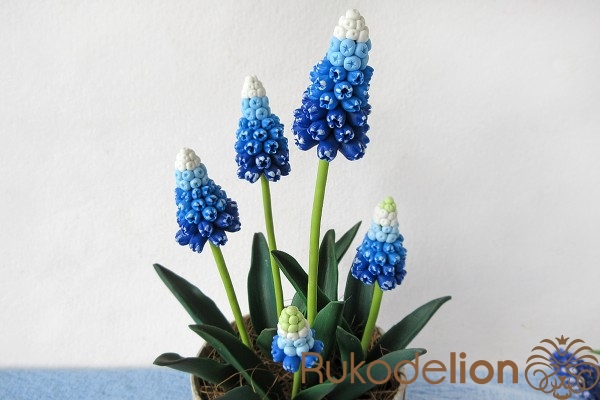 После смешивания кусочков глины у вас должны получиться вот такие оттенки. Если в палитре вашей глины уже есть подходящие готовые оттенки – можете брать их. В природе мускари бывают разных оттенков синего, голубого, фиолетово-голубого и даже белого цвета, поэтому не обязательно брать точно такие цвета, какие использовала я.