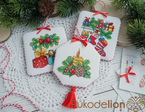 Склеиваем наши половинки, предварительно вклеив внутрь петельки из шнура или ленты. Для восьмиугольника я еще добавила кисточку из мулине, которое использовала в вышивке всех трех дизайнов (чтобы выдержать цветовую гамму набора). Можно положить на несколько часов "под пресс", чтобы картон не деформировался.
