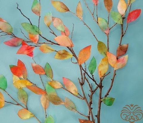Для создания такого вот декоративного осеннего дерева необходимо взять бумажные фильтры для кофеварки, жидкие акварельные краски и газету. Расположите бумажные фильтры на газете, брызните на них воду и нанесите акварельные краски. Мы выбрали зеленые, желтые, оранжевые и коричневые цвета краски. Пока бумажные фильтры будут подсыхать, выйдете на улицу и соберите немного веточек деревьев или кустарников.